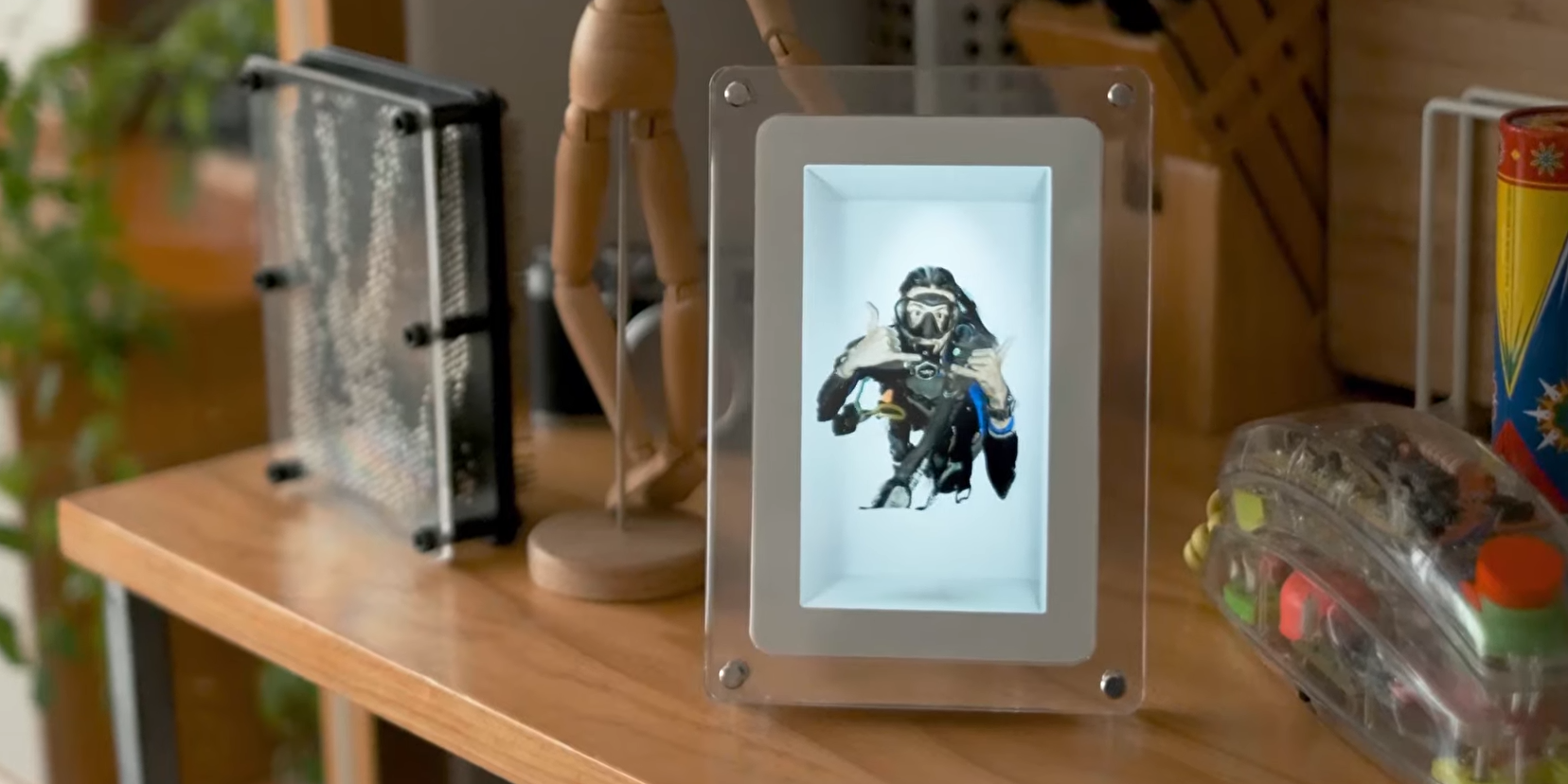 Это 7‑дюймовое устройство с белым матовым обрамлением и дополнительной стеклянной рамкой. Оно может хранить до 1 000 изображений или 30‑секундных видеороликов и показывать их в голографическом формате. Предварительно файлы нужно конвертировать с помощью бесплатного приложения Looking Glass, после чего их можно передать на устройство по USB‑C.